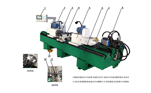3、輥皮數(shù)控加工中心的主要技術(shù)特點(diǎn):(1) 3工位4點(diǎn)式平移機(jī)械手。(2)輥皮鏜孔采用多刃式成型鏜孔刀,(3)用旋壓工藝將軸承座與管子鉚壓連接在一起的技術(shù), (4)多刀式輥皮表面同心校圓加工工藝,(5)管子夾持定位裝置具有徑向糾偏功能,減小了徑向跳動(dòng)量。
